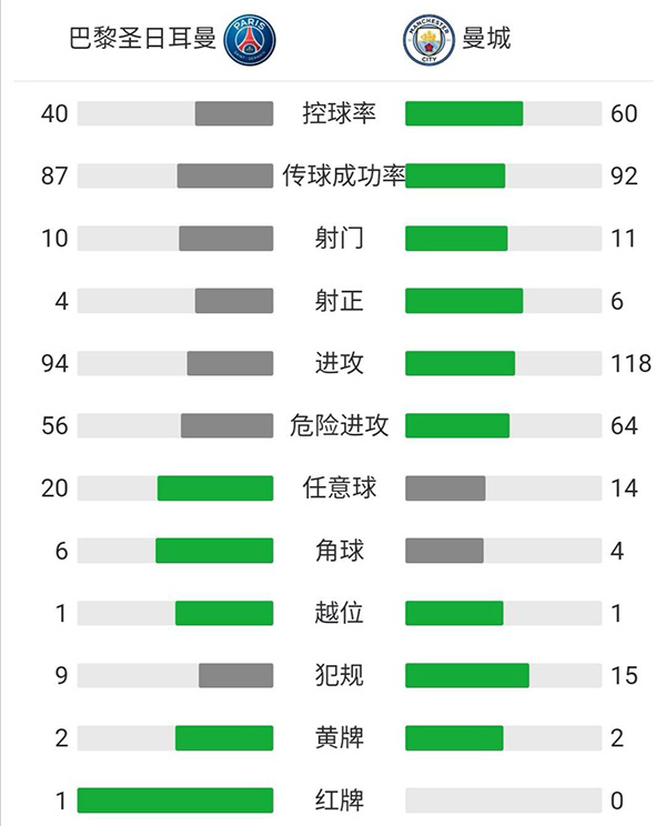 全场比赛结束,曼城客场2-1逆转战胜巴黎圣日耳曼。