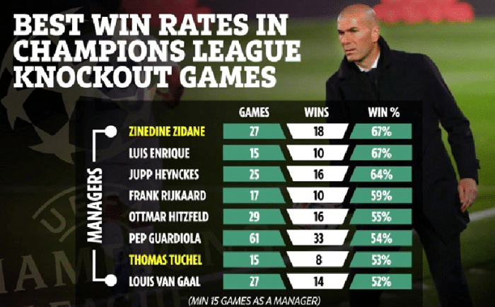 如图,上图是至少带队参加过15场以上欧冠淘汰赛的主帅的胜率排名,其中齐达内的排名最高的是,他带队参加了27场欧冠淘汰赛,其中拿到了18场胜利,胜率是67%。不得不说,齐达内在欧冠淘汰赛的胜率真的很高。而排名第二的是前巴萨主帅恩里克,他带队15次参加欧冠淘汰赛,拿到了10场胜利,胜率也是67%,只不过因为场次比齐达内少,才区居第二。