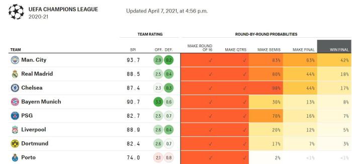 根据该网站的预测,曼城的夺冠概率达到了42%,晋级决赛的概率达到了63%。