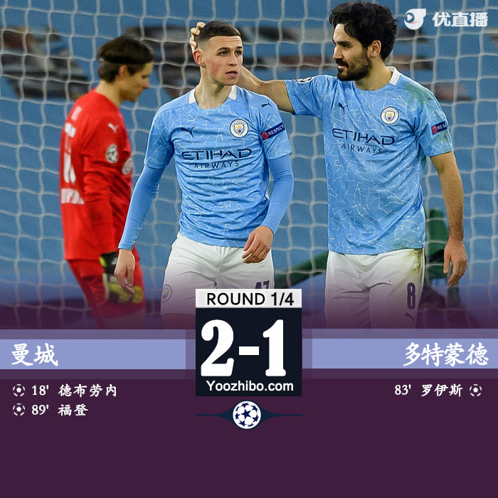 全场比赛结束,首回合曼城主场2-1战胜多特。