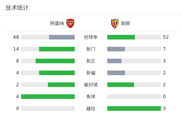 关键事件: 第13分钟,朗斯头球解围不远,热苏斯争抢到,哈弗茨赶在门将之前将球捅进球门!阿森纳1-0领先朗斯↓