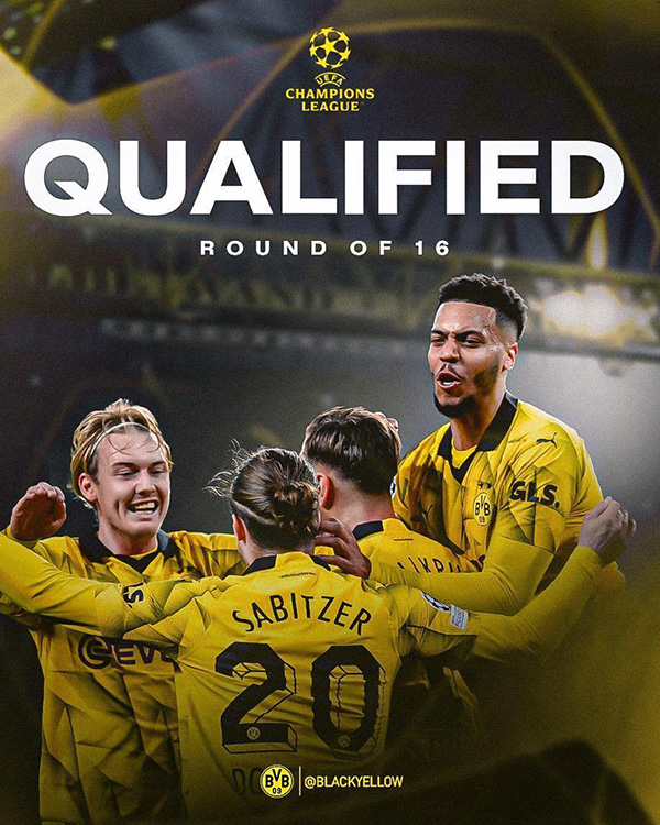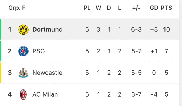 5轮过后,多特蒙德积分来到了10分提前1轮出线。大巴黎7分暂列第2,纽卡斯尔和AC米兰同积5分,米兰因为净胜球劣势垫底。末轮比赛将在12月4日凌晨4点打响,多特蒙德主场对阵巴黎圣日耳曼,而AC米兰则需要做客挑战纽卡斯尔。