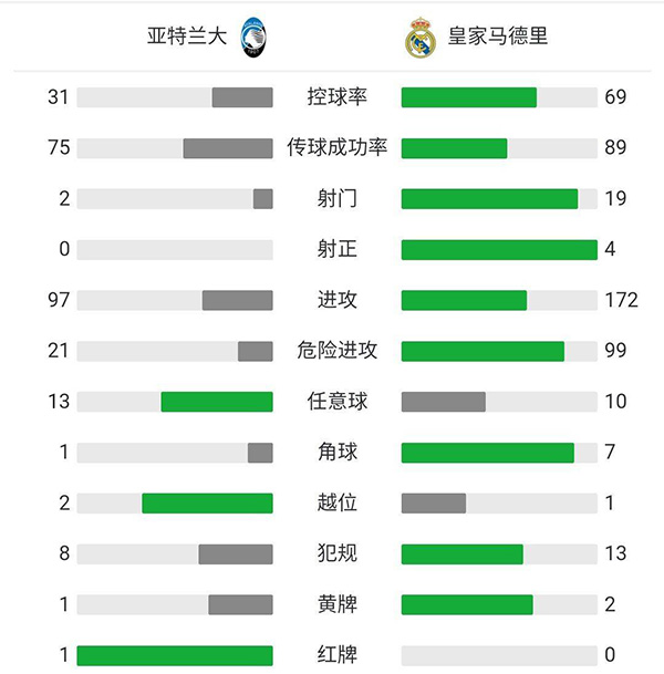 全场比赛结束,皇家马德里客场1-0战胜亚特兰大。
