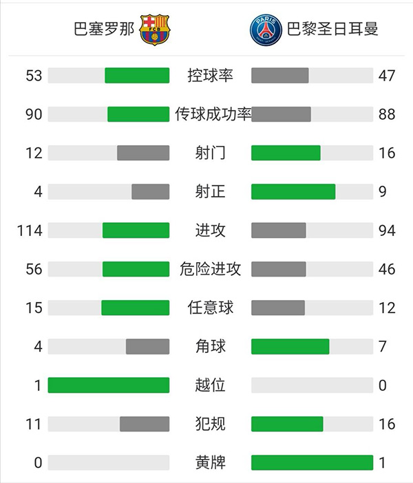 查看:巴塞罗那vs巴黎圣日耳曼 全场录像技术统计: