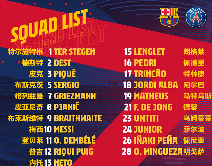 后卫:2-德斯特、3-皮克、15-朗格莱、18-阿尔巴、23-乌姆蒂蒂、24-菲尔波、28-奥斯卡-明格萨;