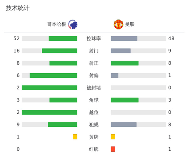 第51分钟,贡萨尔维斯主罚点球一蹴而就,哥本哈根2-2曼联!