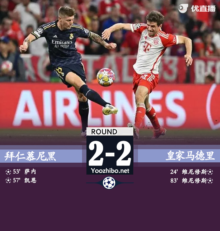 24直播网讯:北京时间5月1日3:00,欧洲冠军联赛 半决赛首回合,拜仁慕尼黑主场对阵皇家马德里。上半场,萨内小角度抽射被扑,克罗斯直塞助攻维尼修斯推射破门,凯恩任意球攻门打偏;下半场,克罗斯弧线球兜射被诺伊尔飞身扑出,萨内内切劲射入网扳平比分,穆西亚拉造点后凯恩点射命中,维尼修斯单刀打门被扑,金玟哉送点后维尼修斯罚进上演梅开二度。最终比分拜仁 2-2 皇马