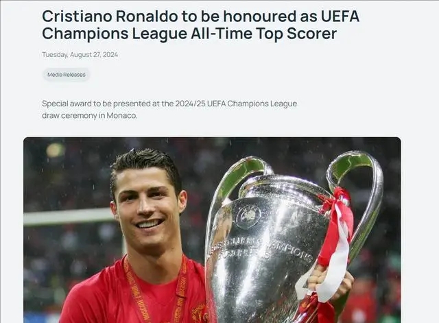 24直播网讯 2024-2025赛季欧冠将进行改制,进入新赛制。欧足联官方宣布,将于当地时间8月29日(北京时间8月30日0点)的欧冠抽签仪式上,向欧冠历史最佳射手C罗授予特殊奖项。