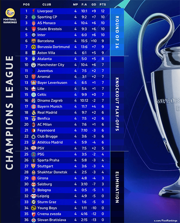 24直播网讯北京时间11月7日凌晨,欧冠联赛阶段第4轮全部比赛结束。本轮过后,英超豪门利物浦成唯一全胜队领跑积分榜。而在利物浦身后排名第2至第4位的,竟然不是传统的欧冠豪门球队,而是葡萄牙体育、摩纳哥和布雷斯特。