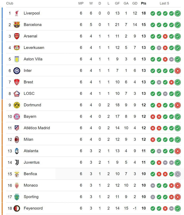 24直播网讯北京时间12月12日凌晨,欧冠联赛阶段结束了第6轮的角逐。本轮过后,仅有利物浦这1队提前出线,前8名中多达6队同积13分,欧冠改制后,出线之争可谓相当惨烈。