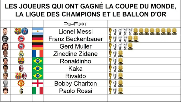 24直播网讯 国外数据博主晒图统计获得过世界杯+欧冠+金球奖的球员,具体如下: