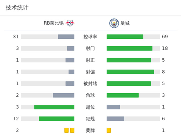 关键事件: 第24分钟,B席送出直塞,刘易斯下底倒三角回敲,福登右脚推射弹地入网,RB莱比锡0-1曼城!