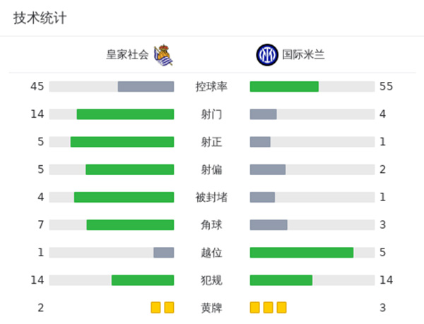 关键事件: 第4分钟,巴斯托尼后场带球被抢断,布莱斯-门德斯直接面对索默推射得手,VAR介入,进球有效,皇家社会1-0国际米兰。