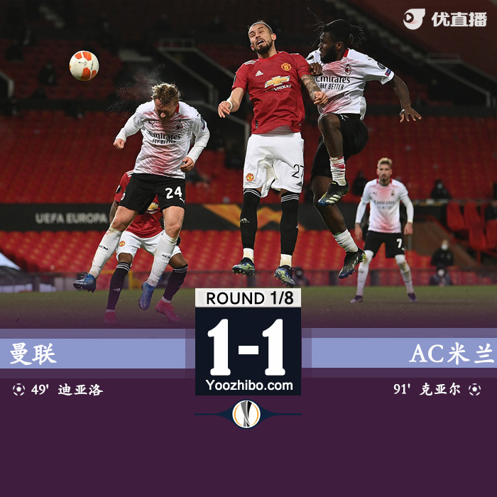 24直播网3月12日讯 北京时间3月12日凌晨1:55,20-21赛季欧联杯1/8决赛首回合,曼联主场迎战AC米兰。上半时,莱奥和凯西进球都被吹掉,马奎尔空门机会中柱。下半时B费助攻迪亚洛回头望月破门,丹尼尔-詹姆斯包抄空门踢偏,补时阶段克亚尔头球绝平。最终,曼联1-1AC米兰,双方次回合比赛是3月19日凌晨4点。