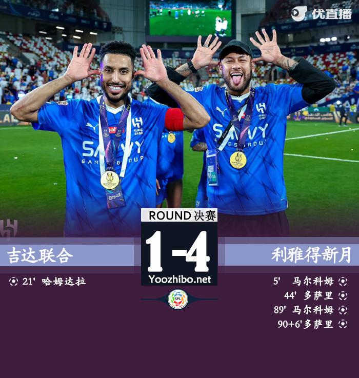 24直播网讯:北京时间4月12日沙超杯决赛,吉达联合主场对阵利雅得新月。吉达联合哈默德破门。上半场,萨利赫-谢赫里助攻马尔科姆破门,率先改写比分。哈默德造点主罚被扑,补射将球打进将比分扳平。萨利赫-谢赫里助攻萨勒姆-达瓦萨里破门,将比分再次超出。下半场,哈默德越位在先,进球被吹无效。阿卜杜勒哈米德越位在先,进球被吹无效。马尔科姆破门完成梅开二度再下一城。纳赛尔-达乌萨里补射破门锁定比分。最终利雅得新月4-1战胜吉达联合取34连胜,夺得23~24赛季沙超杯冠军。