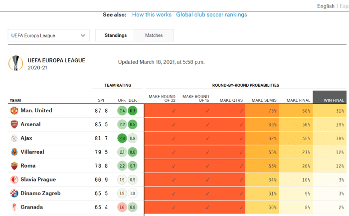 24直播网3月19日讯 本赛季欧联杯的八强全部出炉了,曼联、阿森纳、阿贾克斯、比利亚雷亚尔、罗马、布拉格斯拉维亚、格拉纳达和萨格勒布迪纳摩八支球队晋级欧联杯八强,他们将会在后面的比赛中,去争夺本赛季欧联杯的冠军,那么这八支球队谁能最终夺得本赛季欧联杯的冠军呢?近日,欧洲著名大数据网站“538”,通过大数据分析出了各大球队夺冠的几率,其中曼联夺冠的几率最高,达到了31%。