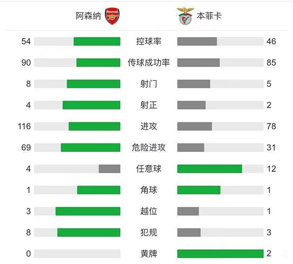 查看:阿森纳vs本菲卡 全场录像技术统计: