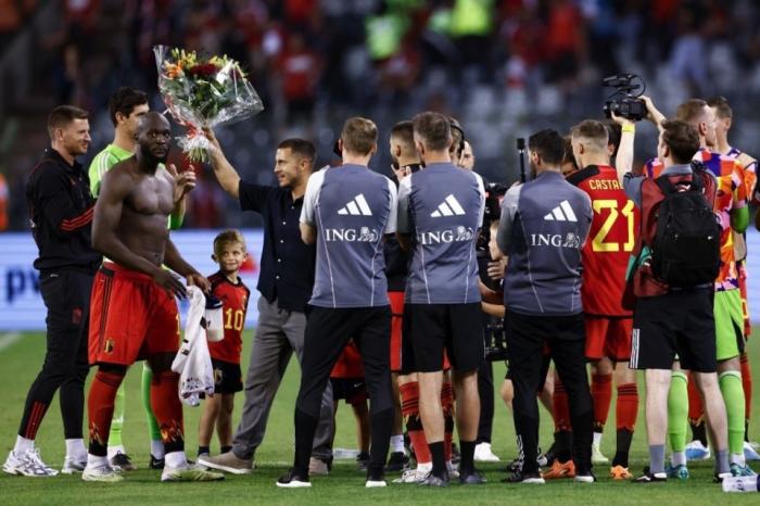 比赛上半场结束后,亲临现场的阿扎尔带着自己的儿子,走进场地内。而国家队队友和工作人员早已经在通道出口处站成两排,为阿扎尔送上了掌声。而阿扎尔则深情地与库尔图瓦、卢卡库、卡拉斯科、蒂勒曼斯等并肩作战多年的老队友,一一拥抱告别。光着膀子的卢卡库,甚至还为阿扎尔送上了鲜花。