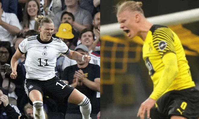 德国女足队长波普本届赛事的表现有目共睹,非常出色,同时她的庆祝动作太抢镜。标志性的庆祝动作令人想到目前效力于曼城的哈兰德,两人之间确实很像,都是非常霸气的球员,长得也有些相似。