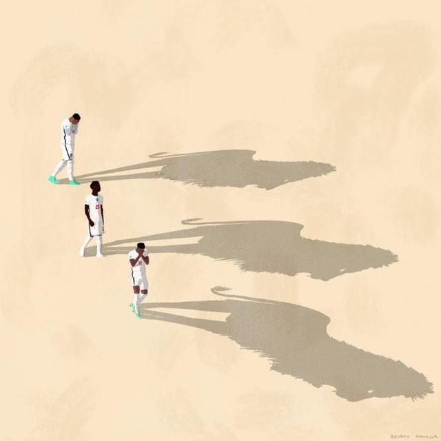 三名球员也因此遭到恶劣的种族歧视攻击,而三狮军团官推今日晒出一张颇具意境的图片,照片中这三名罚丢点球的球员失落的走着,而阳光下他们的倒影是三只狮子,与英格兰的三狮军团外号遥相呼应。
