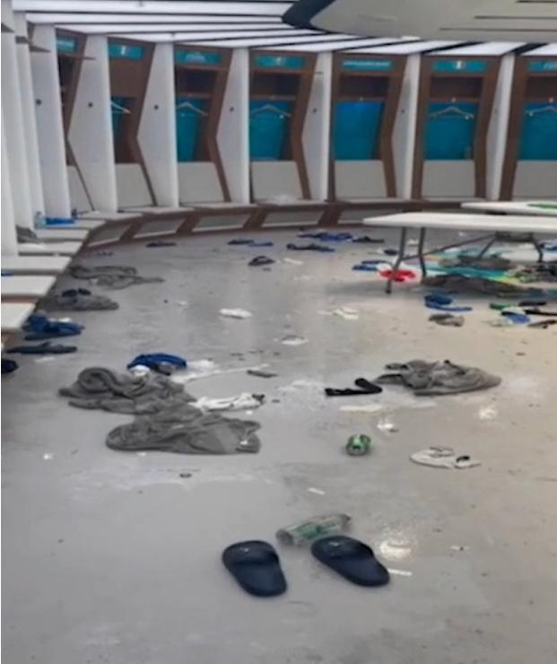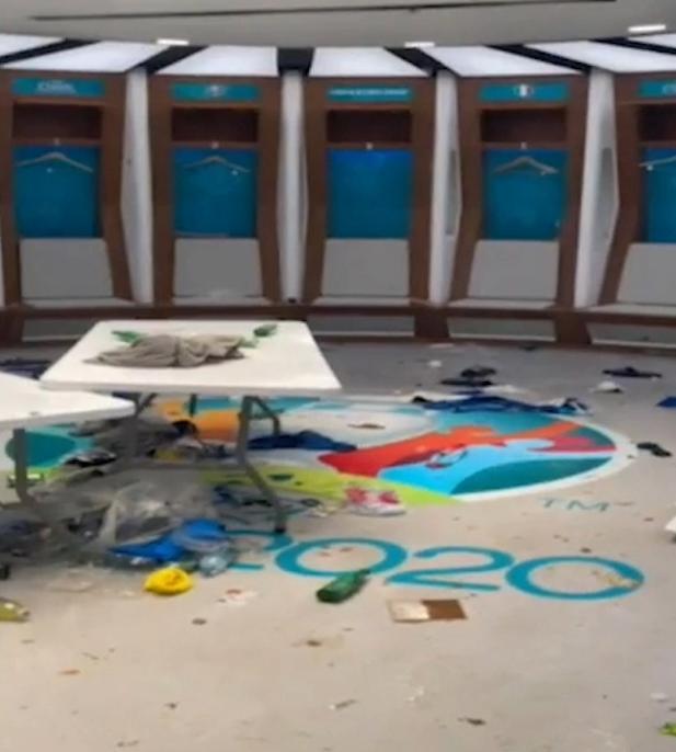 24直播网讯 《太阳报》今日曝光了欧洲杯后意大利更衣室的照片,意大利在庆祝完夺冠后将更衣室弄得满地垃圾,并且没有收拾就离开。