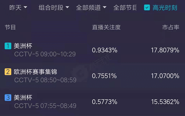 美洲杯决赛和欧洲杯决赛在同时间段收视率都是第一名,而对比起来的话,美洲杯的收视率要更高一些,逼近1%,这是一个什么概念的数据呢?我们都知道很多晚间黄金档的热门电视剧和综艺节目,收视率如果能够破1,就是非常不错的成绩了,而美洲杯在周日上午的收视率高达0.9343%;