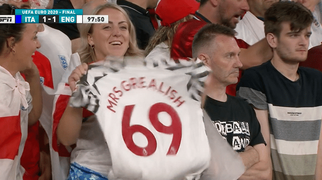 场边抢镜的还有一位美女球迷,当加时赛初期,人气非常高的格拉利什出场,温布利球场爆发出巨大的欢呼声,同时镜头给到了看台上的一名女球迷,他拿的球衣是英格兰队的战袍,上面写的是“格拉利什夫人”,号码更加有趣,并非是格拉利什的7号,而是“69”号,这也被不少的球迷调侃是直接在看台上用最直接的方式表白格拉利什,还要给他生孩子的感觉。