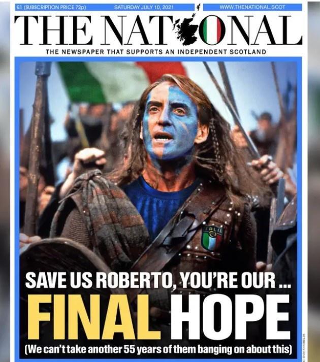 苏格兰媒体《国民报》用电影《勇敢的心》P图“救救我们,曼奇尼,你是我们最后的希望”,“足球回罗马了(itiscomingRome)”