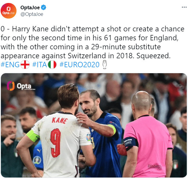 24直播网讯 据OPTA数据统计,英格兰队长凯恩在今天的欧洲杯决赛中120分钟0射门并创造0次机会。