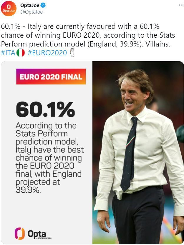 24直播网讯 OPTA近日用数据模型对欧洲杯决赛作出预测,意大利夺冠概率为60.1%。