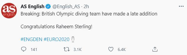 许多人都认为斯特林假摔骗点,西班牙《阿斯报》更是直指这位曼城边锋跳水,他们在推特上写道:“重大新闻!英国奥运跳水队征召了一名新成员,祝贺你,斯特林!”