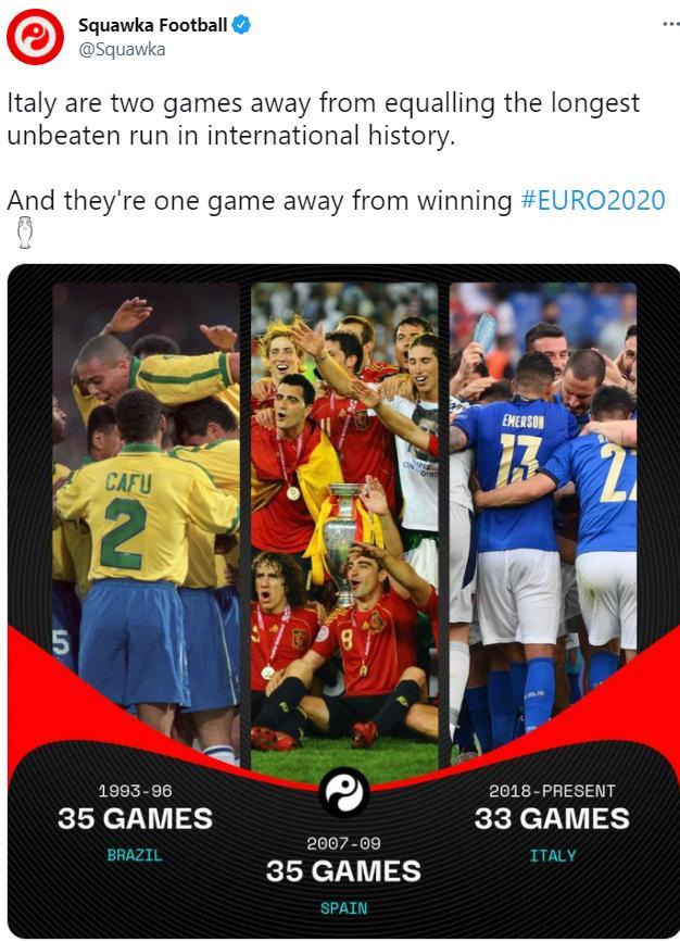 24直播网讯 今天凌晨,意大利击败西班牙杀入欧洲杯绝杀,现在蓝衣军团已经连续33场不败,距离世界足坛国家队最长的连续不败纪录只差2场。