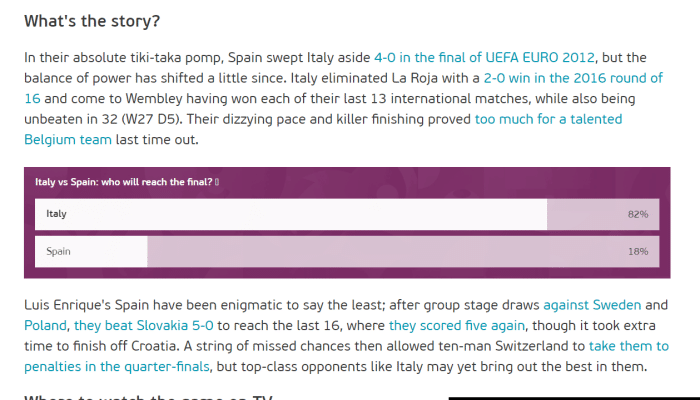 随后,欧足联发布问卷调查,让球迷投票选择谁能晋级决赛,其中82%的球迷支持意大利晋级,只有18%的球迷认为西班牙会晋级。当然,这和两队的表现有关,西班牙虽然可以掌控比赛的局面,但是他们总是会浪费就会,而意大利的踢法更加务实,更加直接,这样的球队晋级的可能性更大,但是双方都有就会,个人感觉,其实这场比赛是五五开的比赛。