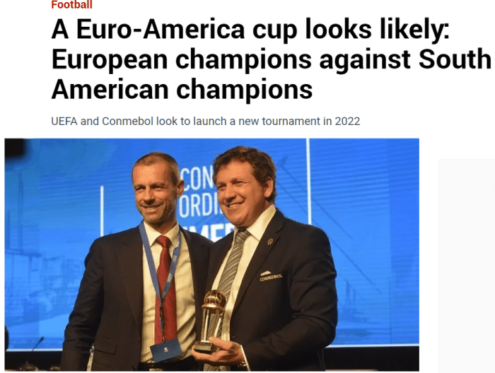 报道表示,欧足联主席切费林和南美足联主席多明戈斯正在推动这项赛事的举办,这项赛事可能允许参加欧洲杯和美洲杯决赛的球队参加,但更有可能的是让欧洲杯冠军对阵美洲杯冠军。