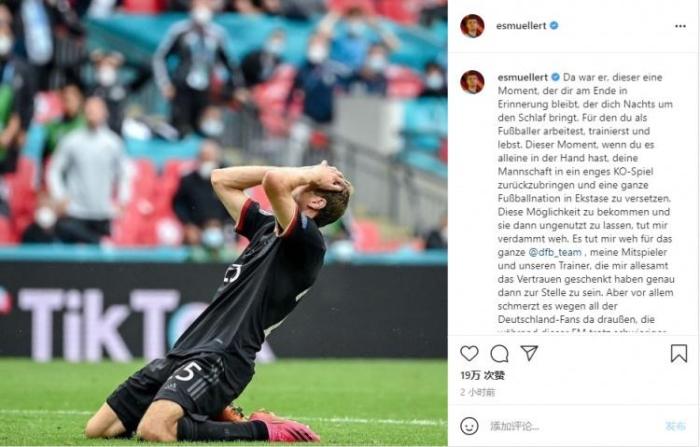 穆勒写道:“就在那一刻会让你永远铭记,难以入睡。作为一名足球运动员,你每天辛苦训练、工作就是为了那一刻,能够在一场势均力敌的淘汰赛中,带领自己所在的球队赢得胜利。能够有这个机会却没有把握住让我很伤心,这对于整个德国国家队的球员和教练来说都是很难过的时刻。是团队给了我信心和支持才让我能够出现在那里。而更最重要的是,尽管有很多困难的情况下,所有德国球迷仍然在欧洲杯期间支持着我们。这会让我们更加难过,谢谢所有球迷的支持。”