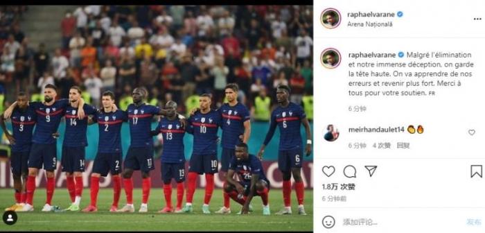 比赛结束后,法国中卫瓦拉内在社交媒体中发布了一张全队搭肩站在一起的合影,并配文。