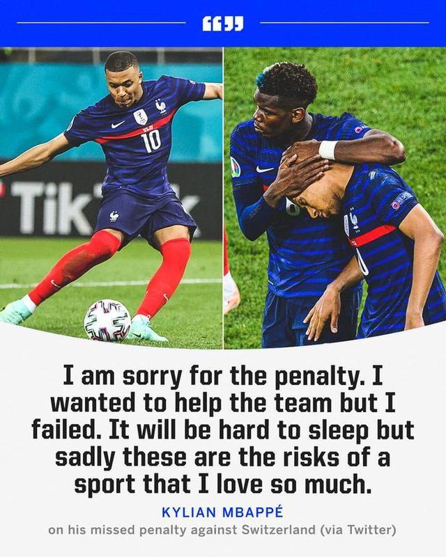 24直播网讯 今天凌晨,法国在欧洲杯1/8决赛的点球大战中爆冷遭到瑞士淘汰,罚丢点球的姆巴佩在赛后接受了媒体采访。