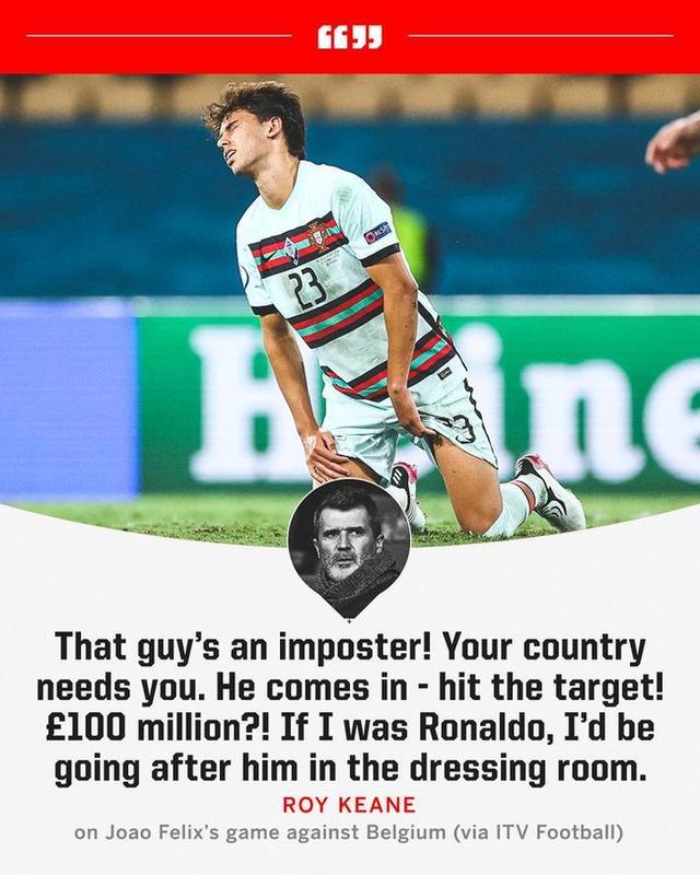 24直播网讯 今天凌晨,葡萄牙在欧洲杯1/8决赛中0-1不敌比利时,赛后ITV评论员罗伊-基恩狠批了菲利克斯和B费。