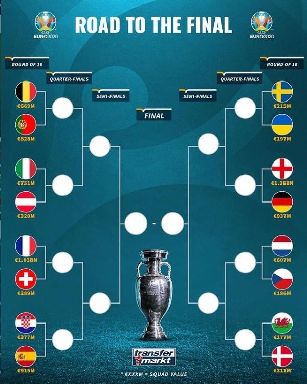 24直播网讯 此前,欧洲杯16强在已经确定了对阵,德国转会市场也统计了各组对决的身价情况: