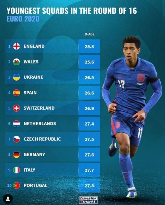 24直播网讯 昨晚,欧洲杯16强淘汰赛已经打响,此前德转市场统计了欧洲杯16强的平均年龄排行,英格兰队平均只有25.3岁是16支球队中最年轻的。
