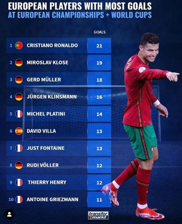 24直播网讯《德国转会市场》也统计了这份榜单的前十。其中,C罗凭借着在小组最后一轮中的梅开二度,登顶榜首!
