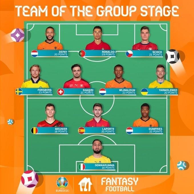 24直播网讯 欧足联今日公布了欧洲杯小组赛阶段的最佳阵容评选结果,C罗29分最高分领衔。