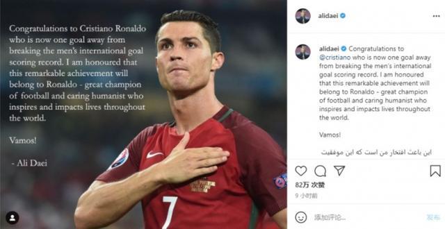 24直播网讯 伊朗传奇球星阿里-代伊日前在Instagram上发文祝贺C罗,他表示这位葡萄牙巨星将影响全世界。