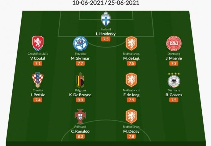 24直播网讯 昨晚,随着E组与F组比赛的结束,欧洲杯小组赛阶段的比赛已经全部结束,WhoScored评出了小组赛阶段的最佳阵容,C罗领衔,德布劳内在列,德佩入选。