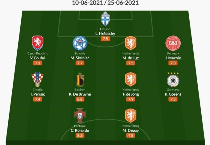 欧洲媒体WhoScored评出了欧洲杯小组赛阶段的最佳阵容,具体阵容如下:门将:赫拉德茨基(芬兰),后卫:曹法尔(捷克)、什克里尼亚尔(斯洛伐克)、德里赫特(荷兰)、迈赫勒(丹麦),中场:佩里西奇(克罗地亚)、德布劳内(比利时)、德容(荷兰)、戈森斯(德国),前锋:C罗(葡萄牙)、德佩(荷兰) 。