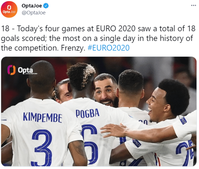 这4场比赛8支球队一共为球迷贡献了18个进球,创造了欧洲杯历史单个比赛日的最多进球纪录。