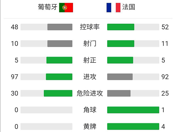 全场比赛结束,葡萄牙2-2战平法国。