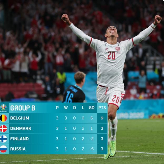 本届赛事,丹麦首轮0-1不敌芬兰,次轮1-2不敌比利时,但最后一轮他们凭借大胜晋级。B组四支球队踢完全部比赛之后,丹麦、芬兰和俄罗斯都积3分,三队小循环积分相同,而丹麦净胜球最多,因此获得第二名。