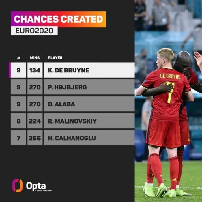 24直播网讯 根据OPTA数据统计,德布劳内在本届欧洲杯至今只踢了134分钟的比赛记,但却创造出了最多的机会。