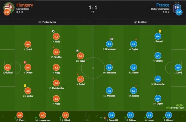 法国首发:洛里6.5、迪涅6.9、金彭贝6.4、瓦拉内6.4、帕瓦尔6.4、拉比奥特6.3、坎特7.1、博格巴6.6、姆巴佩7.0、本泽马6.8、格列兹曼7.6